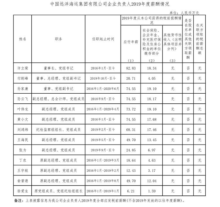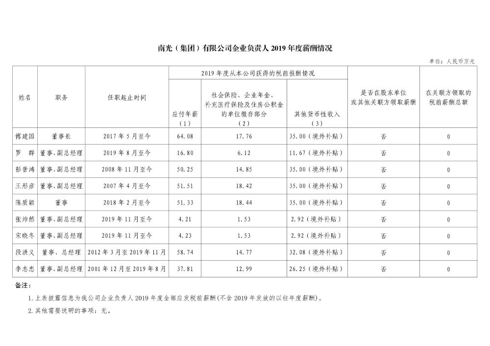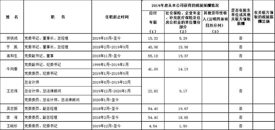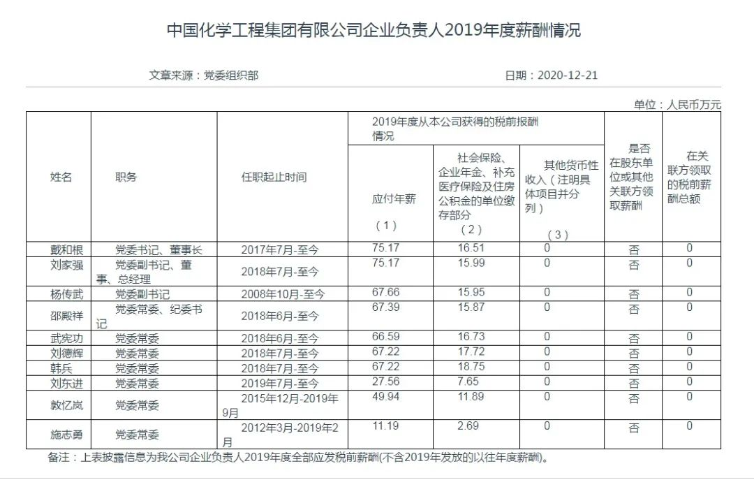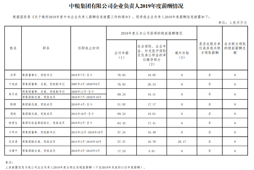 近日,国务院国资委考核分配局公布90多家中央企业负责人2019年度薪酬信息,详情如下。 1 中国核工业集团 有限公司 2 中国航天科技集团 有限公司 3 中国航天科工集团 有限公司 4 中国航空工业集团 有限公司 5 中国船舶集团 有限公司 6 中国兵器工业集团 有限公司 7 中国兵器装备集团 有限公司 8 中国电子科技集团 有限公司 9 中国航空发动机集团 有限公司 10 中国石油天然气集团 有限公司 11 中国石油化工集团 有限公司 12 中国海洋石油集团 有限公司 13 国家电网有限公司 14 中国南方电网有限 责任公司 15 中国华能集团 有限公司 16 中国大唐集团 有限公司 17 中国华电集团 有限公司 18 国家电力投资集团 有限公司 19 中国长江三峡集团 有限公司 20 国家能源投资集团 有限责任公司 21 中国电信集团 有限公司 22 中国联合网络通信集团 有限公司 23 中国移动通信集团 有限公司 24 中国电子信息产业集团 有限公司 注:由于中国电子信息产业集团有限公司原网页链接失效,故薪酬信息缺失。 25 中国第一汽车集团 有限公司 26 东风汽车集团 有限公司 27 中国一重集团 有限公司 28 中国机械工业集团 有限公司 29 哈尔滨电气集团 有限公司 30 中国东方电气集团 有限公司 31 鞍钢集团有限公司 32 中国宝武钢铁集团 有限公司 33 中国铝业集团 有限公司 34 中国远洋海运集团 有限公司 35 中国航空集团有限公司 36 中国东方航空集团 有限公司 37 中国南方航空集团 有限公司 38 中国中化集团有限公司 39 中粮集团有限公司 40 中国五矿集团有限公司 41 中国通用技术(集团)控股 有限责任公司 42 中国建筑集团有限公司 43 中国储备粮管理集团 有限公司 44 国家开发投资集团 有限公司 45 招商局集团有限公司 46 华润(集团)有限公司 47 中国旅游集团有限公司 [香港中旅(集团)有限公司] 48 中国商用飞机有限 责任公司 49 中国节能环保集团 有限公司 50 中国国际工程咨询 有限公司 51 中国诚通控股集团 有限公司 52 中国中煤能源集团 有限公司 53 中国煤炭科工集团 有限公司 54 机械科学研究总院集团 有限公司 55 中国中钢集团有限公司 56 中国钢研科技集团 有限公司 57 中国化工集团 有限公司 58 中国化学工程集团 有限公司 59 中国盐业集团有限公司 60 中国建材集团有限公司 61 中国有色矿业集团 有限公司 62 有研科技集团有限公司 63 矿冶科技集团有限公司 64 中国国际技术智力合作集团 有限公司 65 中国建筑科学研究院 有限公司 66 中国中车集团有限公司 67 中国铁路通信信号集团 有限公司 68 中国铁路工程集团 有限公司 69 中国铁道建筑集团有限公司 70 中国交通建设集团 有限公司 71 中国普天信息产业集团 有限公司 72 中国信息通信科技集团 有限公司 73 中国农业发展集团 有限公司 74 中国林业集团有限公司 75 中国医药集团有限公司 76 中国保利集团有限公司 77 中国建设科技有限公司 78 中国冶金地质总局 79 中国煤炭地质总局 80 新兴际华集团有限公司 81 中国民航信息集团 有限公司 82 中国航空油料集团 有限公司 83中国航空器材集团 有限公司 84 中国电力建设集团 有限公司 85 中国能源建设集团 有限公司 86 中国黄金集团有限公司 87 中国广核集团有限公司 88 中国华录集团有限公司 89 华侨城集团有限公司 90 南光(集团)有限公司 [中国南光集团有限公司] 91 中国西电集团有限公司 92 中国铁路物资集团 有限公司 93 中国国新控股 有限责任公司 94 中国汽车技术研究中心 有限公司